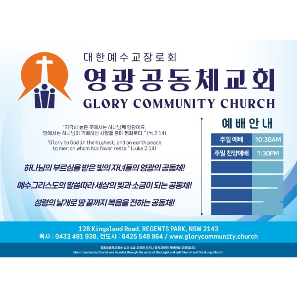대한예수교장로회(백석) 영광공동체교회 담임목사 최요한 주일예배 오전 10:30 주일오후QT예배 1:30 128 Kingsland Road, REGENTS PARK, NSW, 2143 이메일 : yohann418@hotmail.com 홈페이지 :…