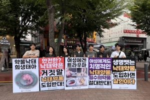 청소년들, 궂은비 속 홍대서 ‘낙태약 도입 반대’ 목소리 높여