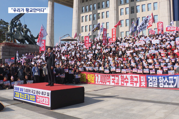 국민의힘 장동혁 대표는 황교안 전 총리가 내란 선전·선동 혐의로 체포되자 "우리가 황교안이다"라고 외치며 이재명 정부를 겨냥한 비판의 목소리를 높였다. 장 대표는 12일 국회 본청 앞에서 열린 대장동 일당 7400억 국고 환수 촉구 및 검찰 항소 포기 외압 규탄대회에서 이 같은 발언을 했다. 그는 대장동 사건의 항소 포기로 성남시민과 국민에게 돌아가야 할 범죄 수익이 환수될 길이 막혔다고 주장하며, 이재명 대통령에 대한 탄핵을 언급했다. 황 전 총리는 부정선거 음모론으로 알려져 있으며, 장 대표는 그를 통해 극우 세력에 기대고 있다는 비판을 받고 있다.