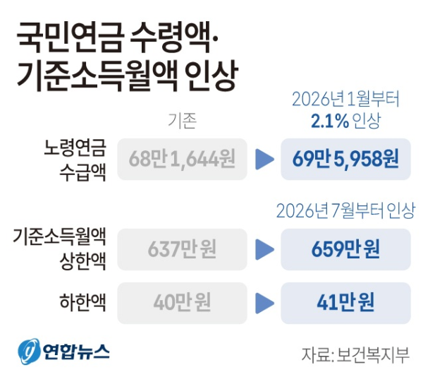 신규 국민연금 수급자의 연금액 산정에 필요한 재평가율도 조정됐다. 이는 가입 기간 동안의 과거 소득을 현재 가치로 환산하는 지표로, 매년 위원회 심의를 통해 조정된다. 기준소득월액 상·하한액도 조정되어, 상한액은 659만 원, 하한액은 41만 원으로 상향된다. 다만, 전체 가입자의 86%는 해당 구간에 속하지 않아 보험료 변동의 영향을 받지 않는다.